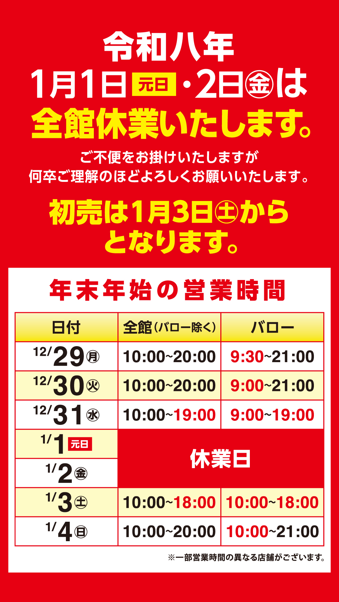営業時間 10:00~20:00 ※一部営業時間の異なる店舗がございます。 ※スーパーマーケットバロー:平日 10:00~21:00 土日 9:30~21:00